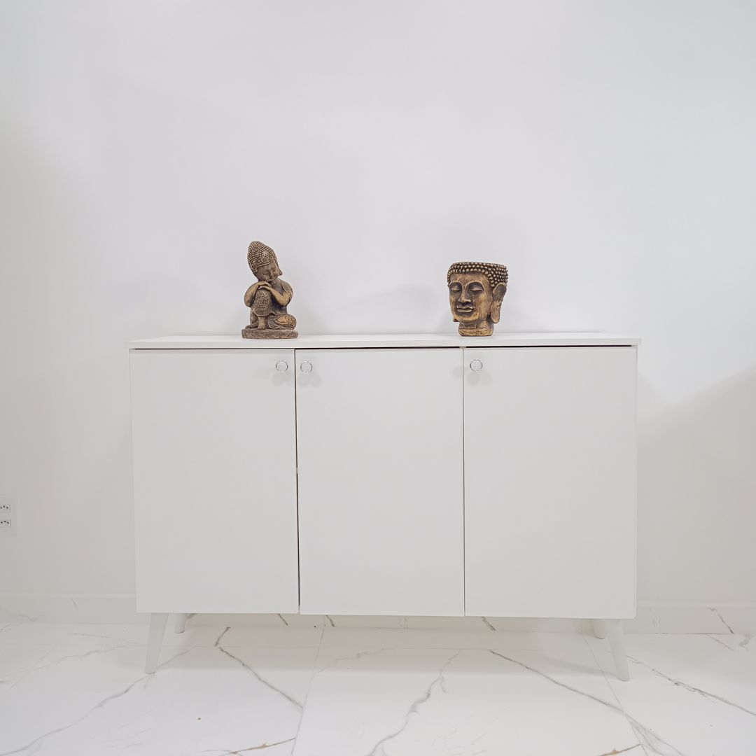 Este armário multiuso de 3 portas combina funcionalidade com um design moderno de inspiração retrô. Com acabamento amadeirado ou branco e pés palito, é ideal para organizar diversos ambientes da casa, como sala, cozinha, lavanderia, escritório ou quarto.