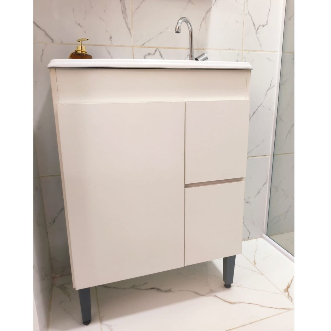 Gabinete com 2 portas e 1 gaveta, oferecendo ótimo espaço para organizar produtos de higiene e limpeza.