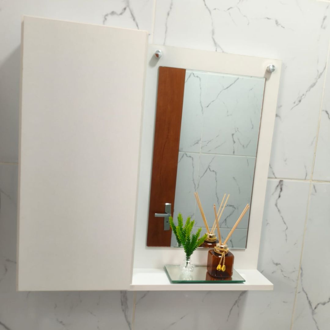Espelheira com armário lateral e prateleira, ideal para armazenar e decorar.