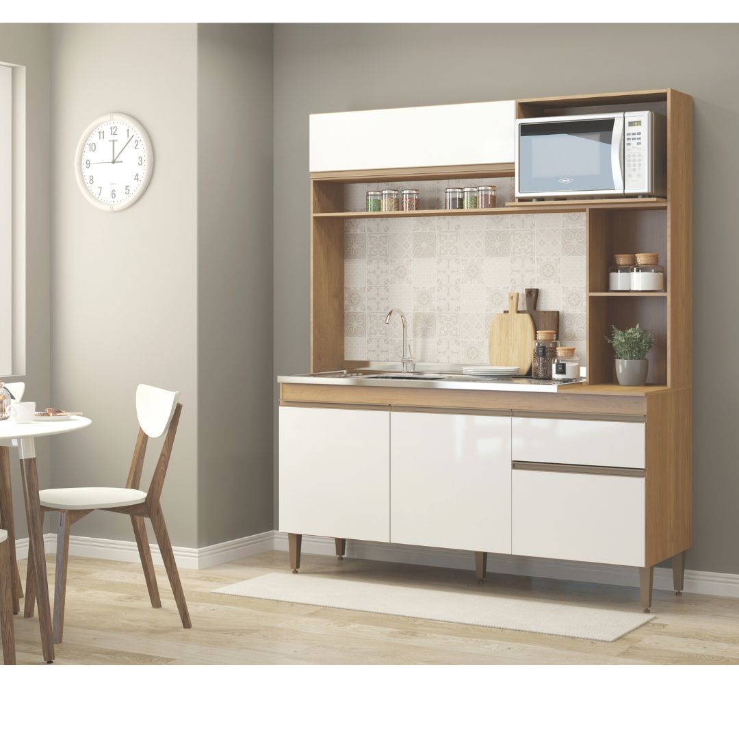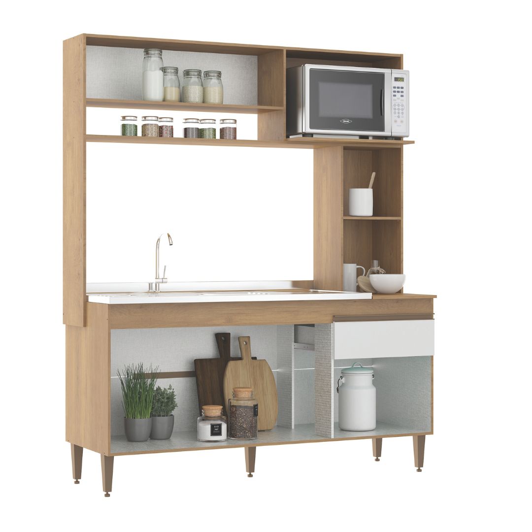Conta com espaço para micro-ondas, nichos abertos, armário superior basculante e balcão inferior com portas e gaveta, garantindo armazenamento inteligente para os utensílios do dia a dia.