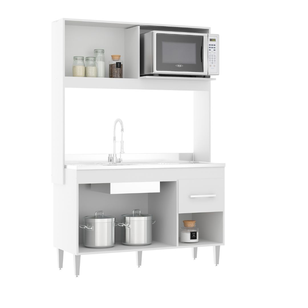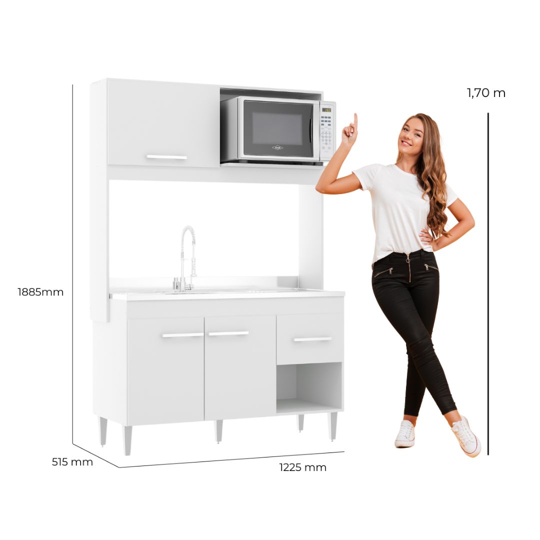 A Cozinha Marina é perfeita para quem busca uma solução compacta e eficiente para organizar o ambiente com charme e funcionalidade. Com design clean em branco e acabamento brilhante, ela se adapta facilmente a qualquer tipo de decoração. Conta com espaço para micro-ondas, armários superiores e inferiores, prateleiras e nichos que otimizam o uso do espaço, tornando sua rotina muito mais prática.