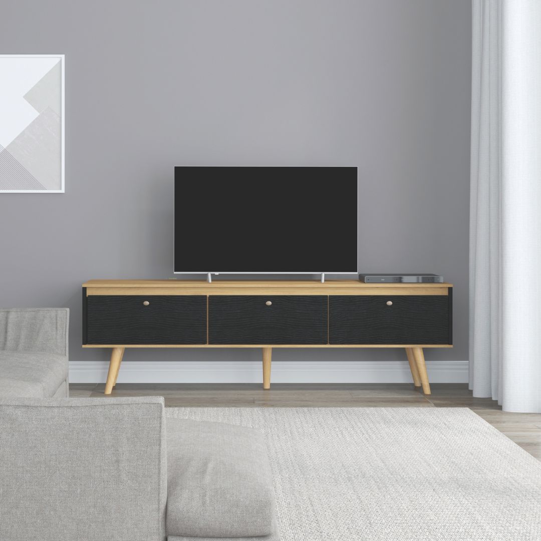 Possui 3 portas com puxadores metálicos, ideais para organizar aparelhos eletrônicos, livros e objetos decorativos. Seus pés inclinados em estilo escandinavo garantem charme e estabilidade.